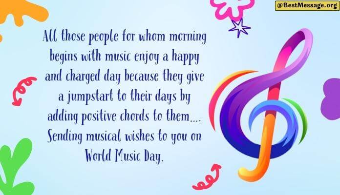 2). All those people for whom morning begins with music enjoy a happy and charged day because they give a jumpstart to their days by adding positive chords to them…. Sending musical wishes to you on World Music Day.