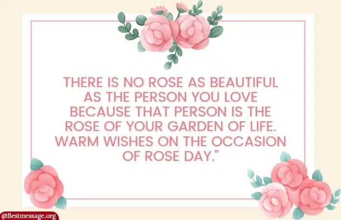“There is no rose as beautiful as the person you love because that person is the rose of your garden of life. Warm wishes on the occasion of Rose Day.”